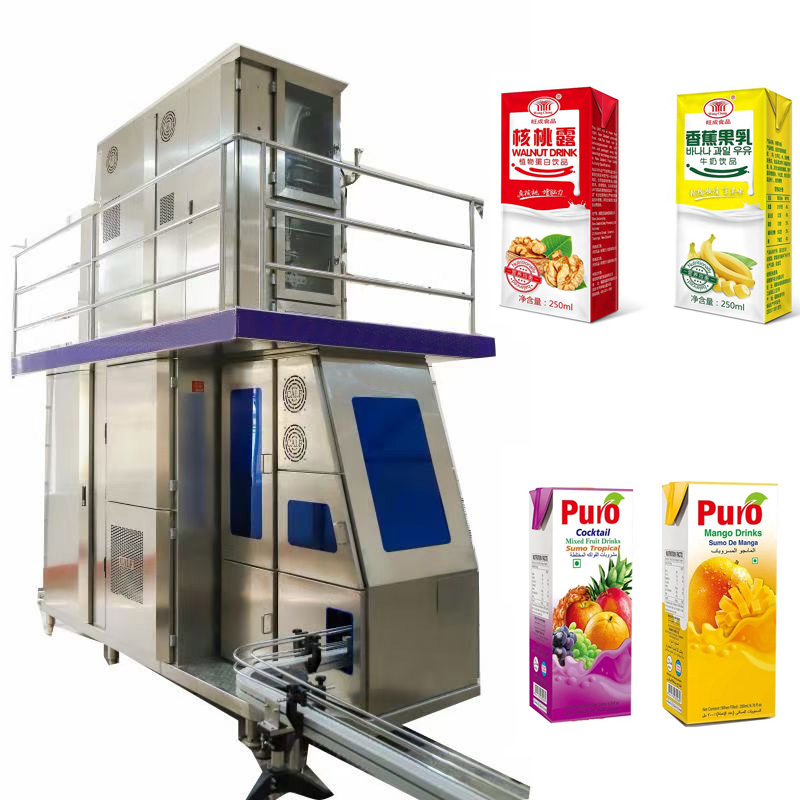 1: Automatic feeding, sterilization, box making, filling, forming and sealing functions are complete in one time. The composite material is sprayed with hydrogen peroxide and high-intensity ultraviolet radiation and dried by aseptic hot air. The forming of the packaging box, the filling of the material and filling of the closures are done in a sterile room with positive pressure to ensure aseptic packaging materials and equipment so packaged UHT-sterilized fruit drinks shelf-life of up to one year at room temperature.